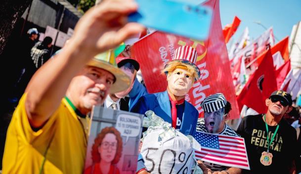 8月至9月,全球多個(gè)國家和地區(qū)的民眾舉行抗議活動(dòng),反對美國關(guān)稅政策。圖為巴西民眾在美國駐圣保羅總領(lǐng)事館前抗議美國對巴西征收高額關(guān)稅。 CFP供圖