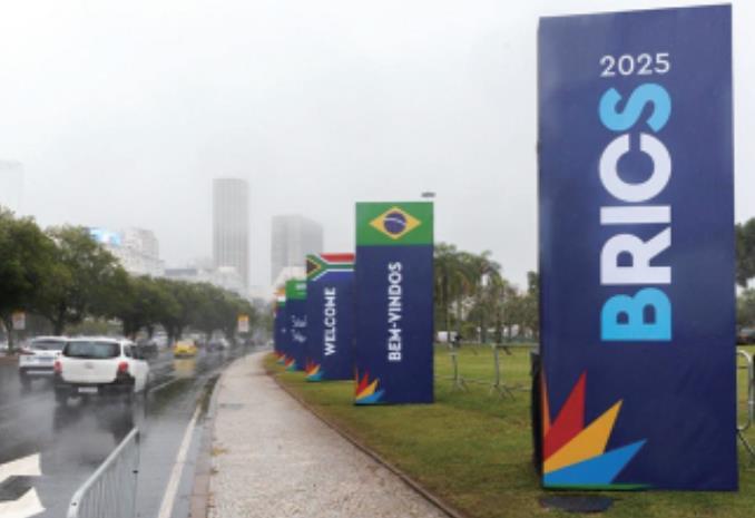 圖為7月3日在巴西里約熱內(nèi)盧拍攝的金磚國(guó)家領(lǐng)導(dǎo)人第十七次會(huì)晤歡迎標(biāo)語(yǔ)牌。 新華社發(fā)