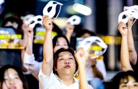 圖為當(dāng)?shù)貢r間2024年8月30日,韓國首爾,抗議者舉行示威,反對深度偽造色情片,活動人士佩戴面具。 CFP供圖