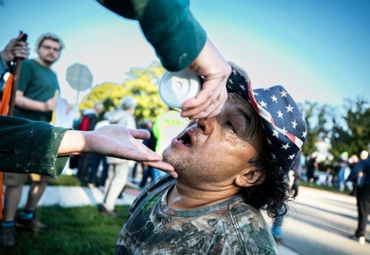 9月26日,在位于美國(guó)芝加哥西郊布羅德維尤市的移民與海關(guān)執(zhí)法局辦事機(jī)構(gòu)外,執(zhí)法人員發(fā)射的催淚彈傷及一名抗議者,同伴在為他進(jìn)行緊急處置。新華社發(fā)(文森特·約翰遜攝)
