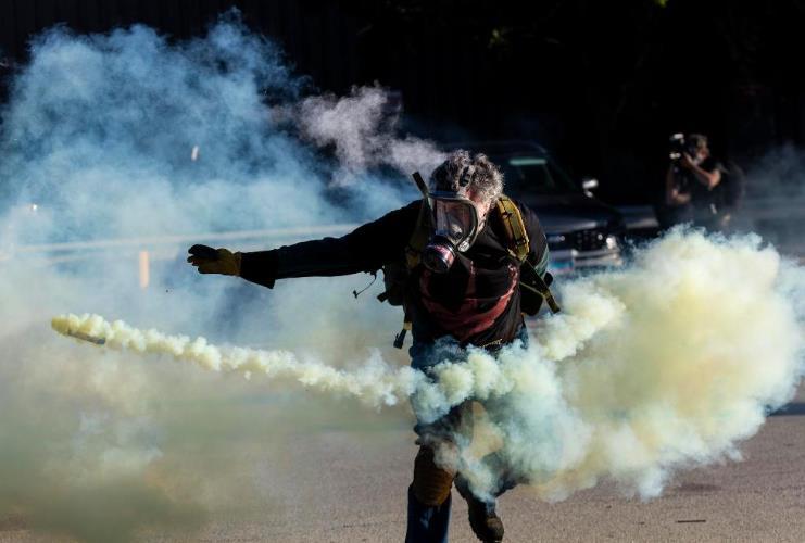9月26日,在位于美國(guó)芝加哥西郊布羅德維尤市的移民與海關(guān)執(zhí)法局辦事機(jī)構(gòu)外,抗議者在沖突中將執(zhí)法人員發(fā)射的催淚彈瓶扔回。新華社發(fā)(文森特·約翰遜攝)