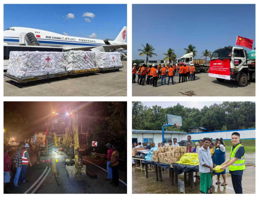 配圖左上:中國救援物資運(yùn)抵科倫坡。配圖右上:中國港灣救援隊(duì)準(zhǔn)備出發(fā)。配圖左下:中企救援隊(duì)伍夜間調(diào)度現(xiàn)場(chǎng)。配圖右下:中建斯里蘭卡分公司向受災(zāi)民眾發(fā)放物資。韓博 攝