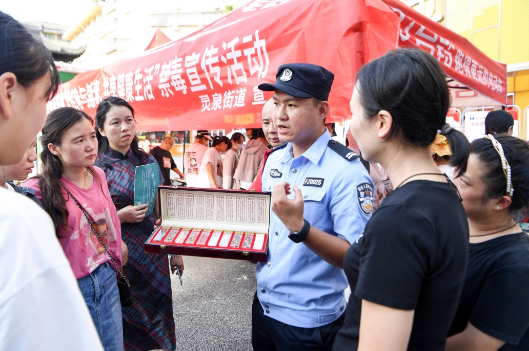近日,江西省宜春市袁州區(qū)靈泉街道聯(lián)合靈泉派出所在鼓樓廣場(chǎng)開(kāi)展“全民參與禁毒、共享健康生活”禁毒宣傳活動(dòng),通過(guò)展示毒品模型、以案釋法、現(xiàn)場(chǎng)答疑等方式,全面提升人民群眾識(shí)毒、防毒、拒毒意識(shí),營(yíng)造全民禁毒濃厚氛圍。