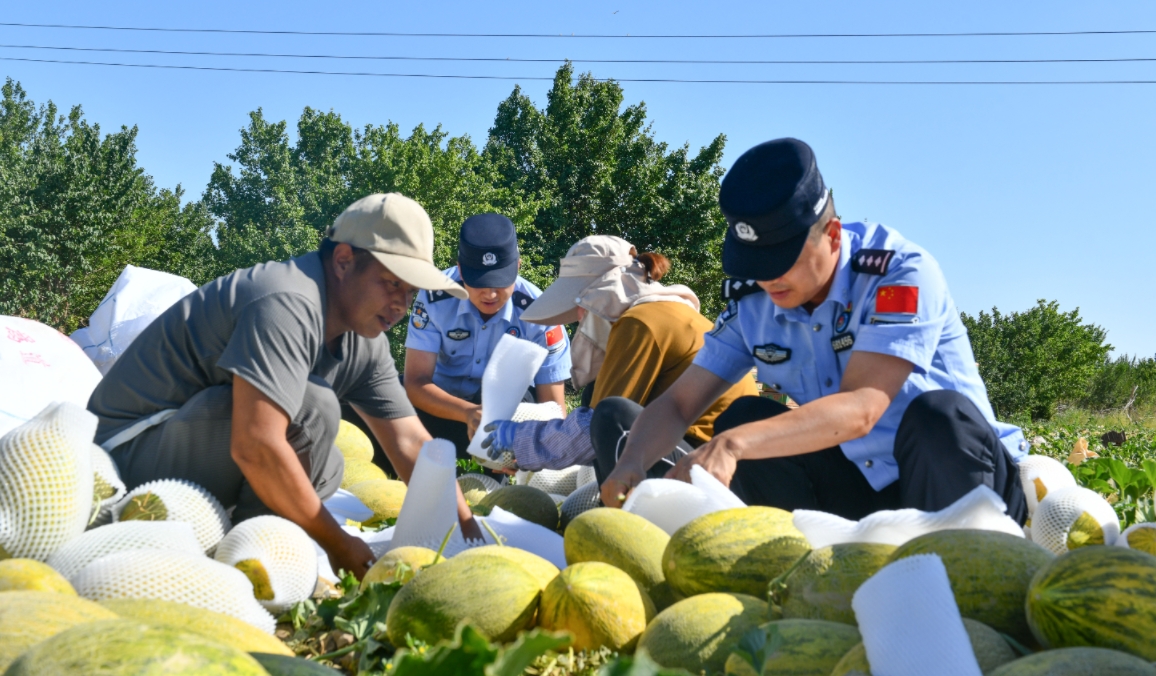 8月24日,新疆哈密市伊吾縣下馬崖鄉(xiāng)千畝瓜田呈現(xiàn)出一派豐收景象,由新疆出入境邊防檢查總站哈密邊境管理支隊下馬崖邊境派出所民警組成的“紅旗黨員服務隊”穿梭在各家瓜農(nóng)的采摘現(xiàn)場,民警幫助瓜農(nóng)采瓜、選瓜、套網(wǎng)、裝箱、貼標、裝車,化身“助農(nóng)能手”穿梭田間,有力護航“甜蜜”豐收。