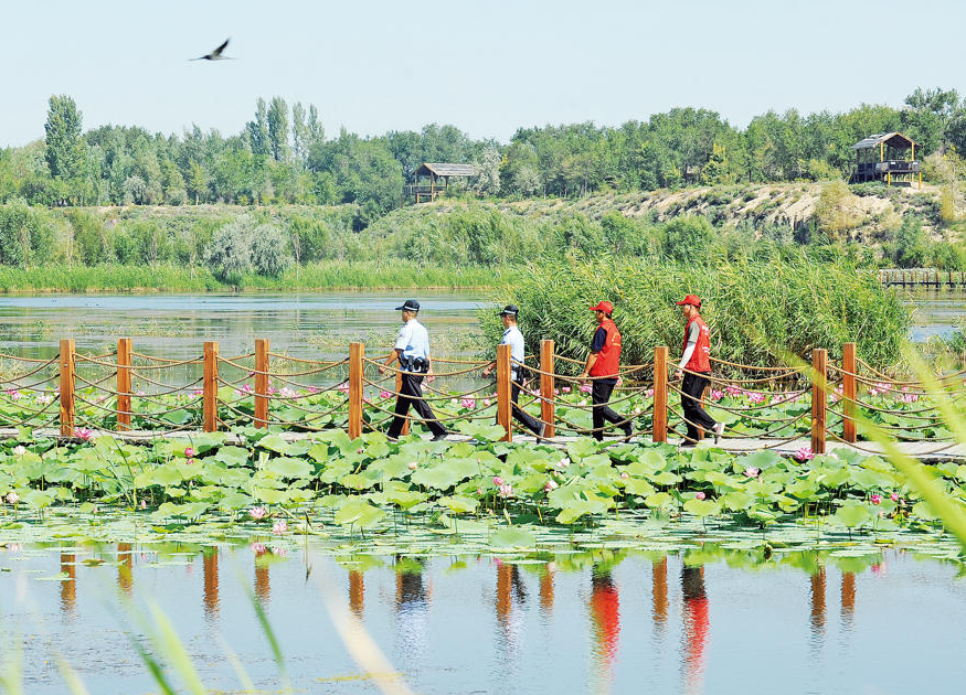 圖為8月19日,瑪納斯縣公安局蘭州灣鎮(zhèn)派出所八家戶警務室民警與瑪納斯國家濕地公園管委會工作人員一同在瑪納斯國家濕地公園開展巡邏。李進福 攝