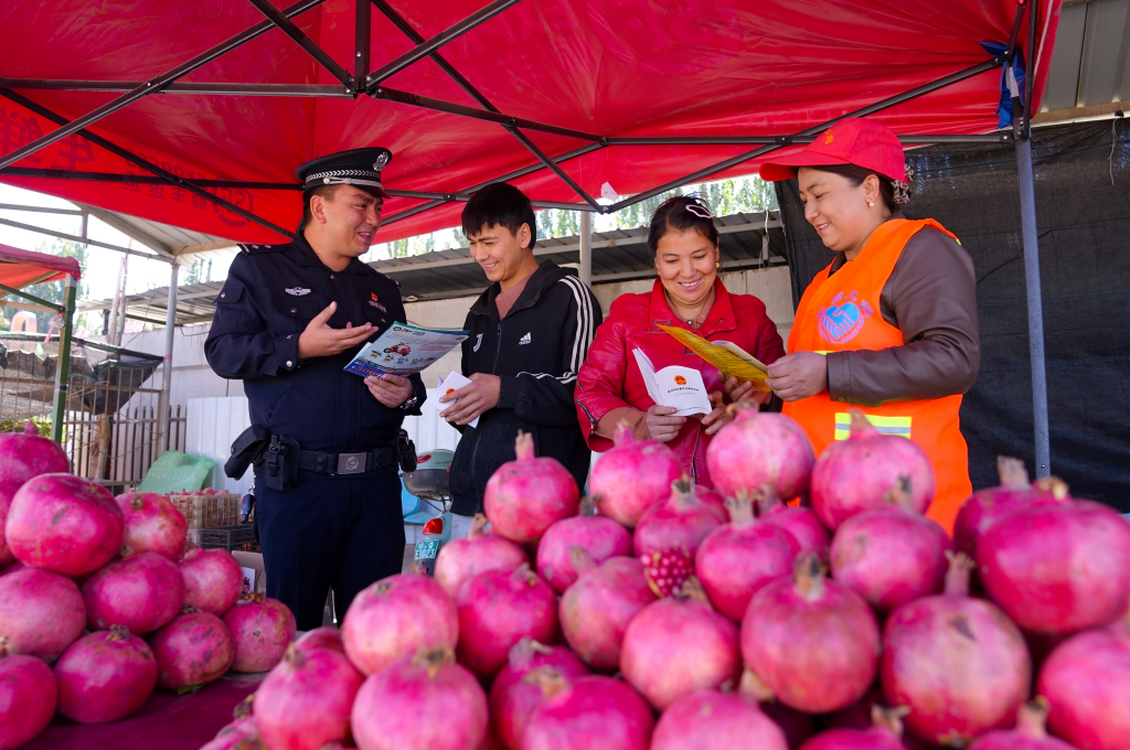 10月12日,新疆維吾爾自治區(qū)葉城縣伯西熱克鎮(zhèn)派出所深入踐行新時代“楓橋經(jīng)驗”,組織“石榴大媽”“石榴義警”等走進轄區(qū)石榴園區(qū)、流動擺攤路段、合作社及打包點等地,開展常態(tài)化巡邏防控、安全隱患排查、安防普法宣傳和矛盾糾紛調處工作。民警與義警向群眾講解防盜防騙、交通安全等知識,及時掌握社情民意,化解潛在風險,用實際行動守護群眾生命財產(chǎn)安全。