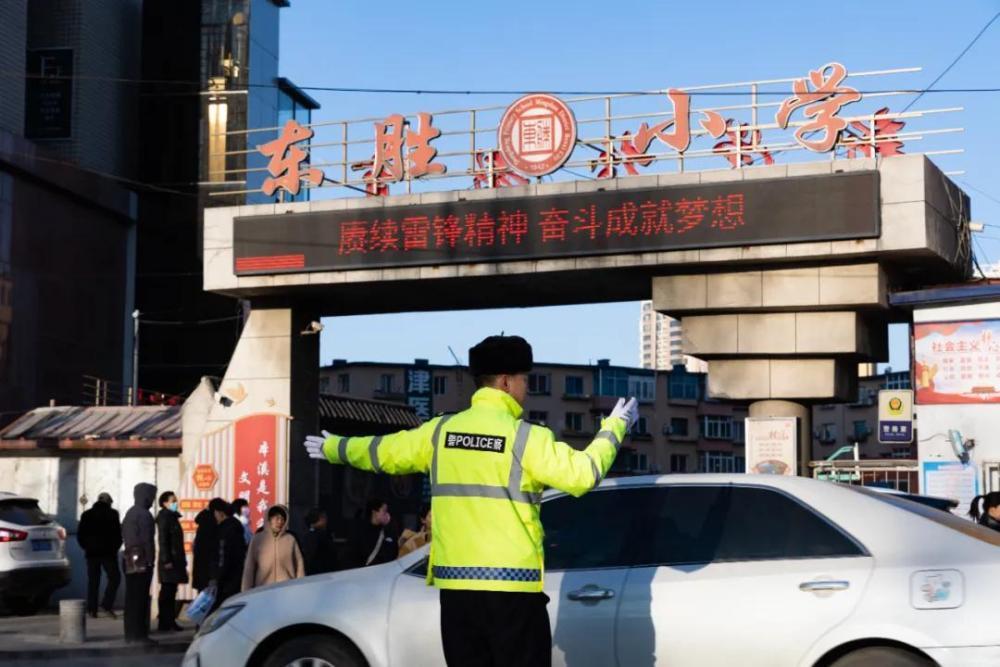 圖為本溪交警正在校園門(mén)口疏導(dǎo)交通。