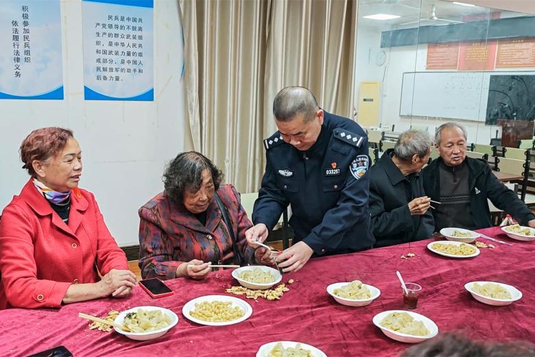 圖為邵奇(中)在重陽節(jié)前夕為轄區(qū)獨居老人辦餃子宴?!?/span>
