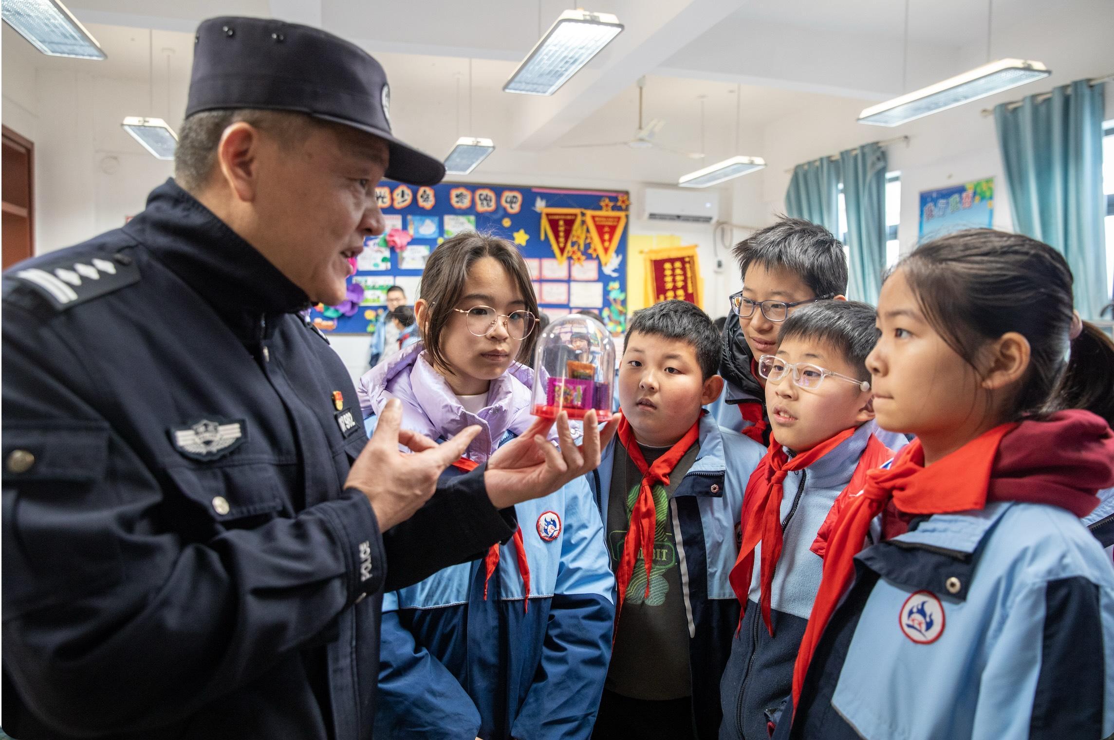 1月5日,在中國人民警察節(jié)來臨之際,湖北省襄陽市公安局襄城區(qū)分局檀溪派出所民警走進(jìn)當(dāng)?shù)匦W(xué)開展禁毒宣傳活動。