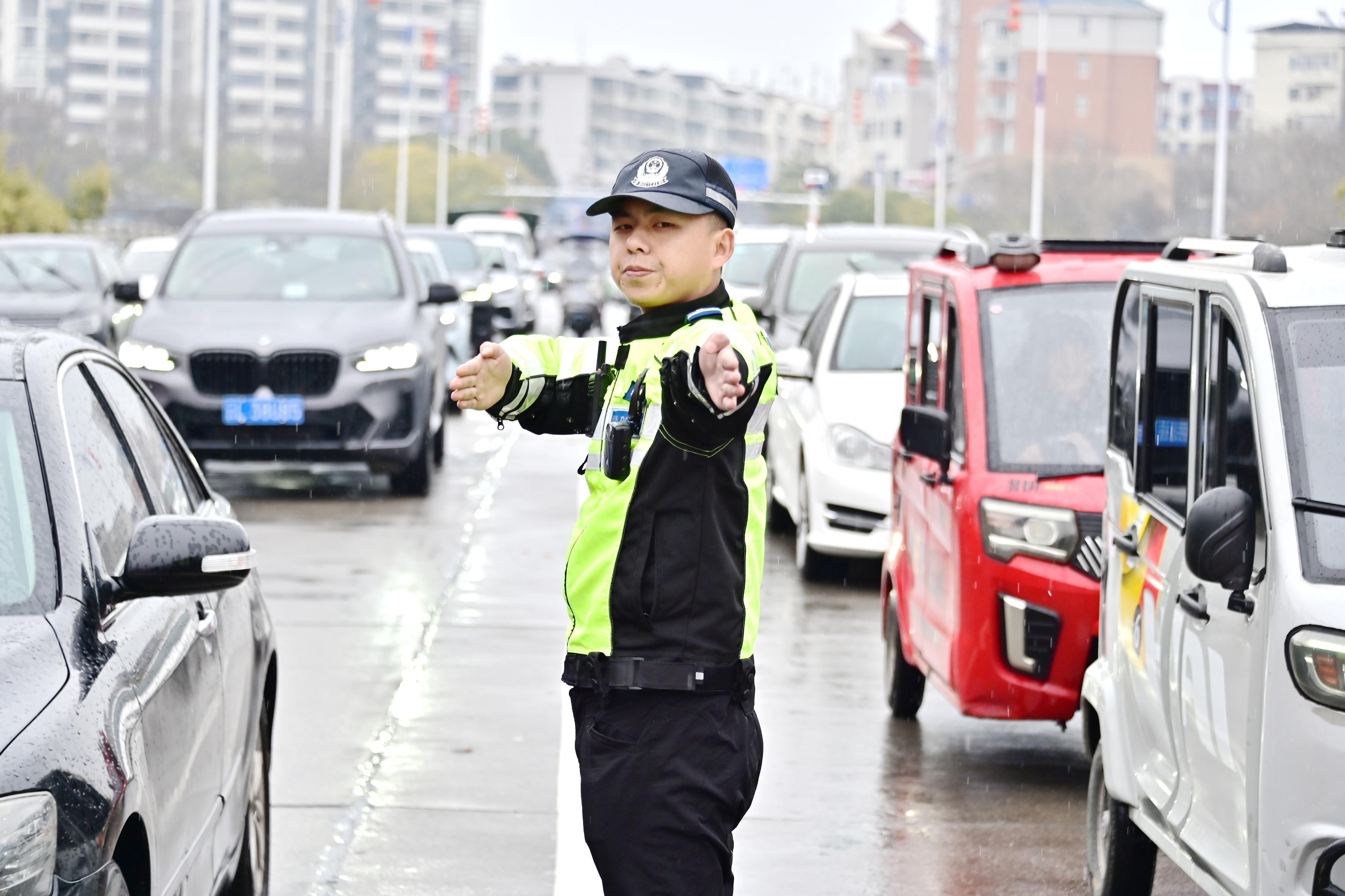 圖為2月9日,民警在縣城主要路段冒雨開展交通疏導(dǎo)。