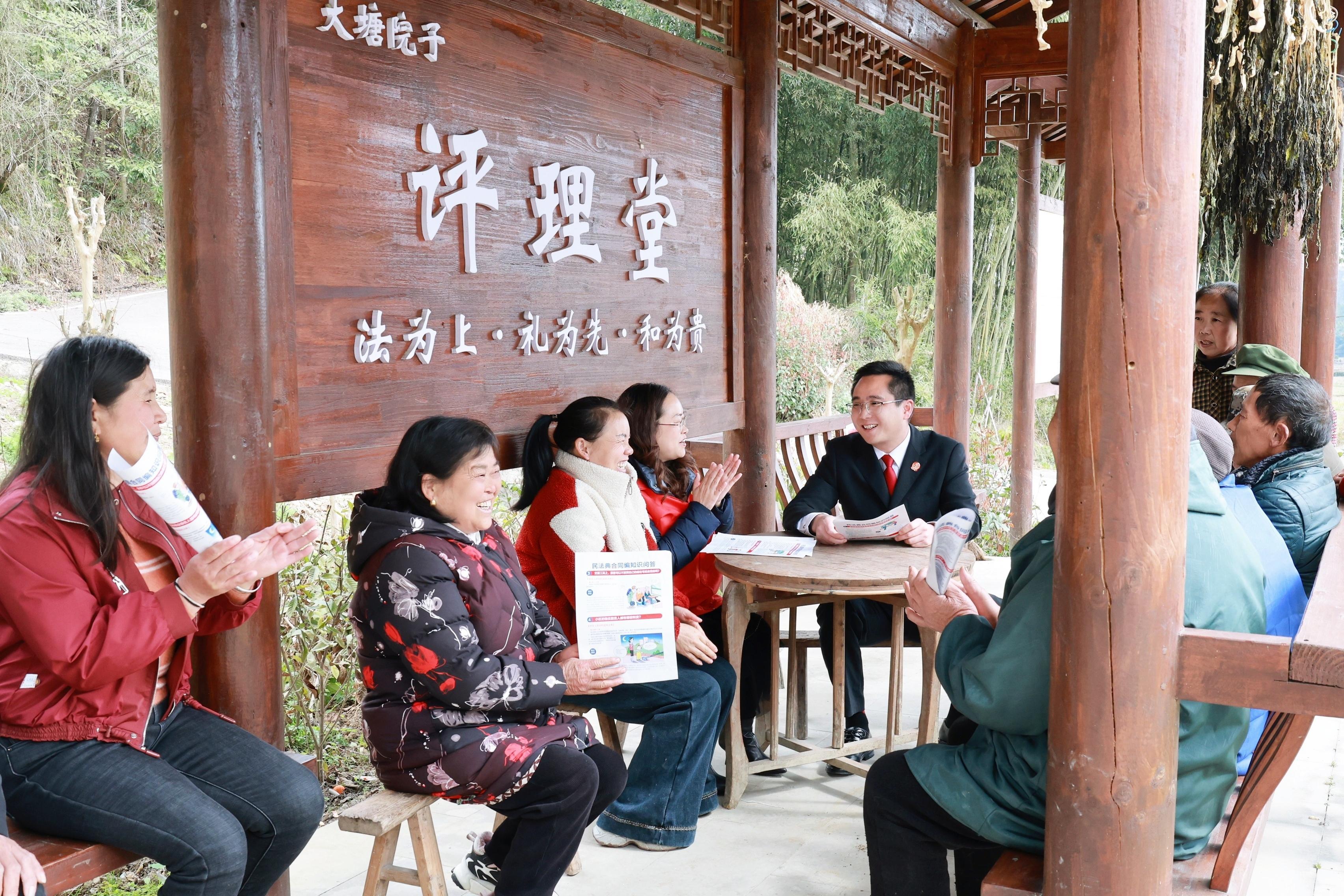 圖為法官與群眾面對面互動交流,主動接受村民法律咨詢。