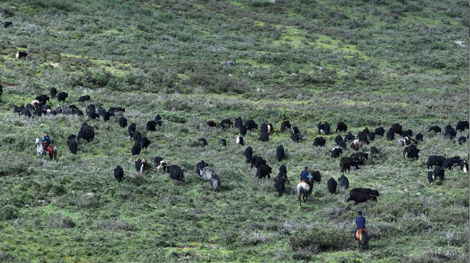 昌戈村夏季牧場地勢平坦,擁有豐富的水草資源,海拔高達(dá)4800米。這里,不僅是牦牛的理想棲息地,也是牧民群眾最理想的牧場之一。此次遷徙轉(zhuǎn)場中,昌戈村牧民呷波、扎西多吉等4家500多頭牦牛浩浩蕩蕩“組團(tuán)”前行。