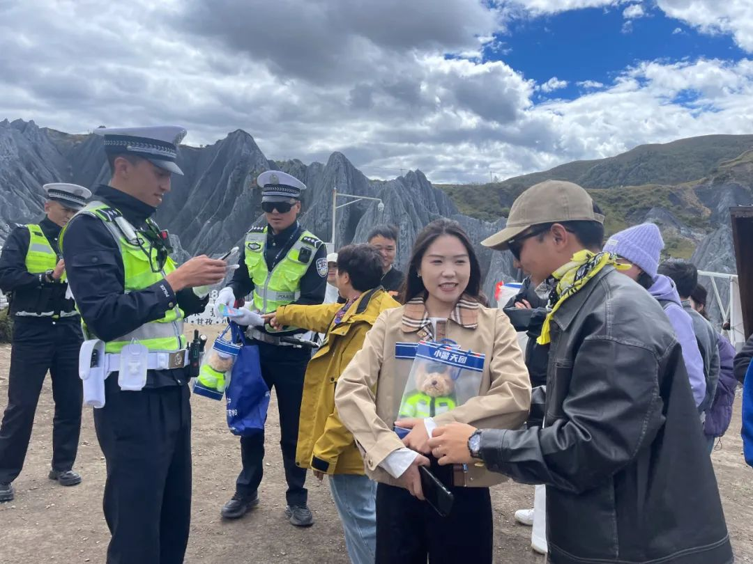 10月1日,在國慶“黃金周”首日,道孚縣八美鎮(zhèn)墨石公園景區(qū)迎來了第一批打卡的游客。道孚縣公安局交警大隊也為遠道而來的客人們,準備了一份精美的小禮品,包含“交警小熊”“水杯”“雨傘”等,游客們只需要回答交警現場開展的“假期平安行·交通安全知識競賽”,答對題目就能帶著禮品繼續(xù)環(huán)游甘孜。