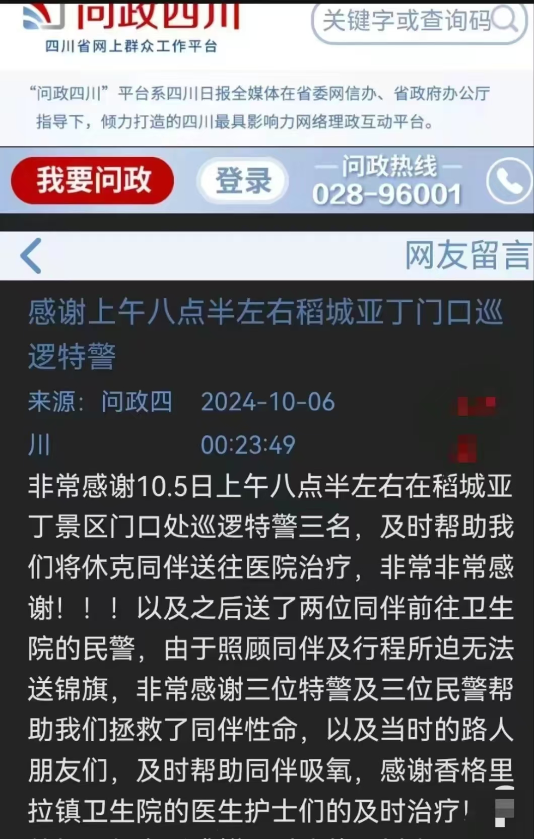 “非常感謝10月5日上午8點半,在亞丁景區(qū)門口的三位特巡警,將我們休克的同伴及時送往醫(yī)院治療。由于照顧同伴及行程所迫無法送錦旗,但這份恩情我們永遠銘記在心!”10月6日,一封來自游客的感謝信投遞在“問政四川”平臺上,信中充滿了他對眾多好心人的感激之情。據稻城縣公安局特巡警大隊副大隊長四郎澤仁介紹,10月5日,亞丁景區(qū)迎來眾多游客。我和隊員們正在景區(qū)門口的執(zhí)勤點位上執(zhí)勤,確保游客的安全和秩序。突然,聽到一陣急促的呼救聲,我們立刻循聲跑去,只見一名女游客倒在地上,身體不停地發(fā)抖,已經陷入休克狀態(tài)?!懊鎸@突如其來的緊急情況,我們按照日常養(yǎng)成的急救常識,立即對游客進行了初步判斷,根據其癥狀和表現,我們判斷是由于缺氧所導致的,并立即對她進行了初步的搶救?!痹诔醪綋尵群螅撚慰偷那闆r雖有所緩解。于是,我和我的戰(zhàn)友們立即開辟起一條“綠色通道”,用警車將患者轉送至鎮(zhèn)衛(wèi)生院。為了不浪費任何一分鐘的治療時間,到達衛(wèi)生院后特巡警隊員將患者背上,送入診療室。當看到游客在醫(yī)生的救治下逐漸恢復意識,我們懸著的心也終于放了下來。那一刻,我們深深地感受到了作為一名警察的責任和使命。