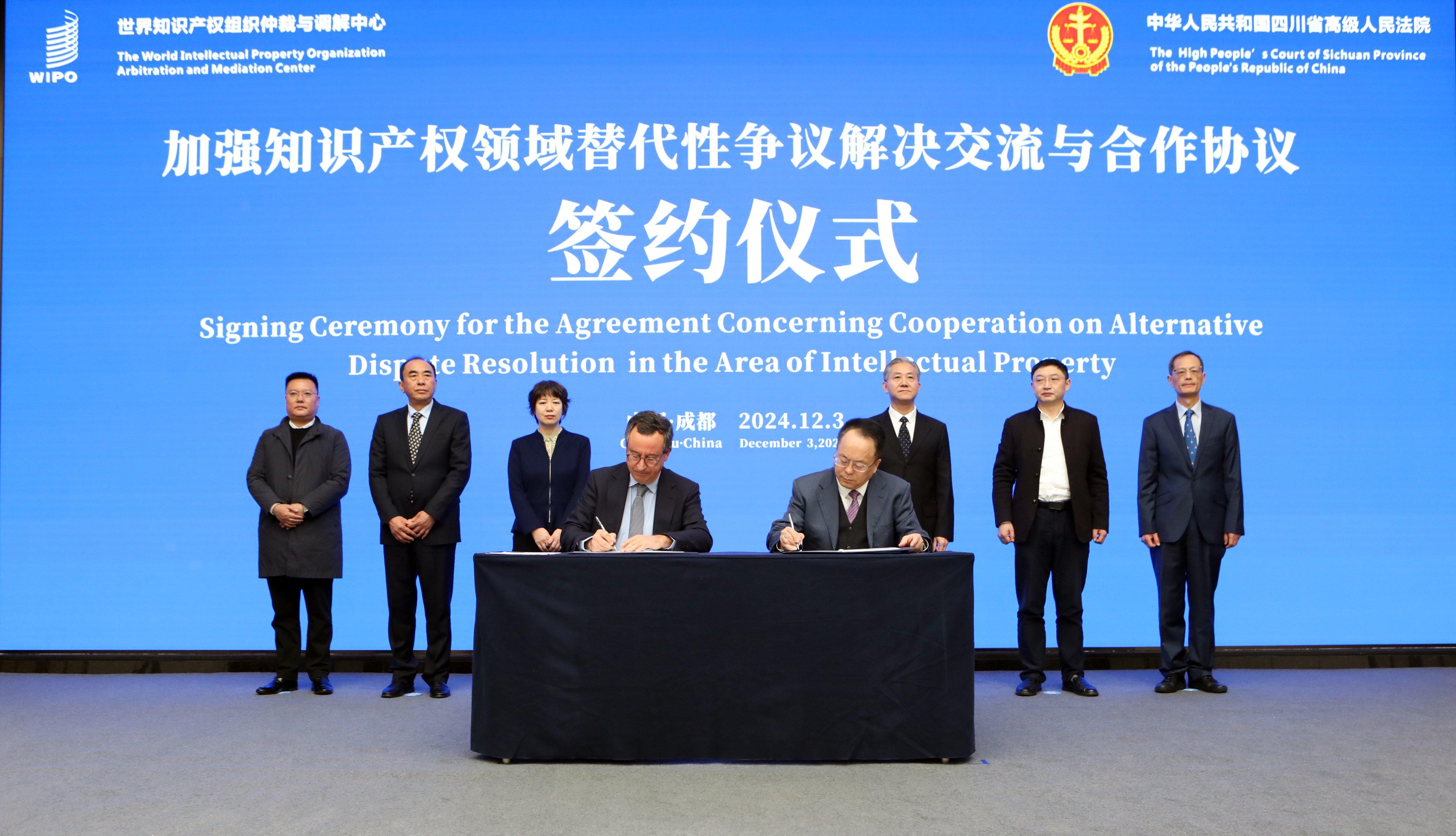 12月3日,四川高院黨組書記、院長王樹江與世界知識(shí)產(chǎn)權(quán)組織仲裁與調(diào)解中心司長伊格納西奧·德·卡斯特羅正式簽署《加強(qiáng)知識(shí)產(chǎn)權(quán)領(lǐng)域替代性爭(zhēng)議解決交流與合作協(xié)議》,這是四川高院為企業(yè)提供更加高效、便捷的糾紛化解機(jī)制的重要舉措?;诖?,在最高人民法院的支持下,四川高院與世界知識(shí)產(chǎn)權(quán)組織仲裁與調(diào)解中心進(jìn)行了近一年的磋商,最終成功簽署合作協(xié)議。