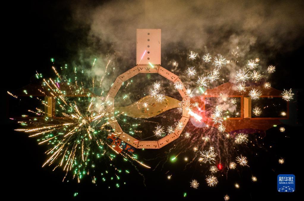 2月2日在浙江省杭州市淳安縣里商鄉(xiāng)拍攝的里商仁燈元宵表演(無人機照片)。