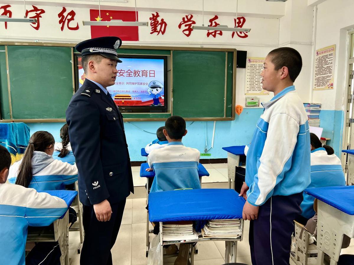圖為2023年4月11日,民警正在向?qū)W生提問有關(guān)全民國家安全教育日的知識。