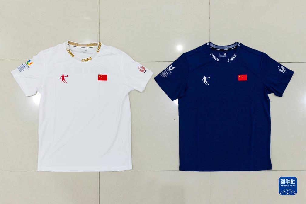 這是7月24日拍攝的第31屆世界大學生夏季運動會中國代表團成員配發(fā)裝備中的短T恤衫。新華社記者 沈伯韓 攝