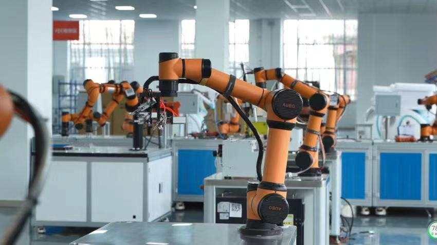 遨博(山東)智能機器人有限公司的六軸協(xié)作機器人,正在演示工業(yè)場景中的模塊組裝