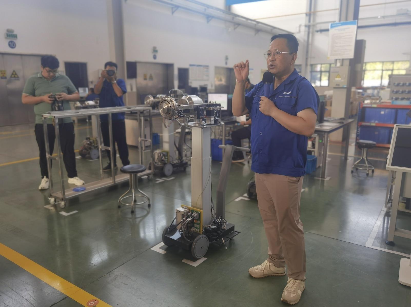 “高質(zhì)量發(fā)展調(diào)研行”采訪團來到位于山東淄博市的山東新華醫(yī)療器械股份有限公司調(diào)研,工作人員王波在進行講解