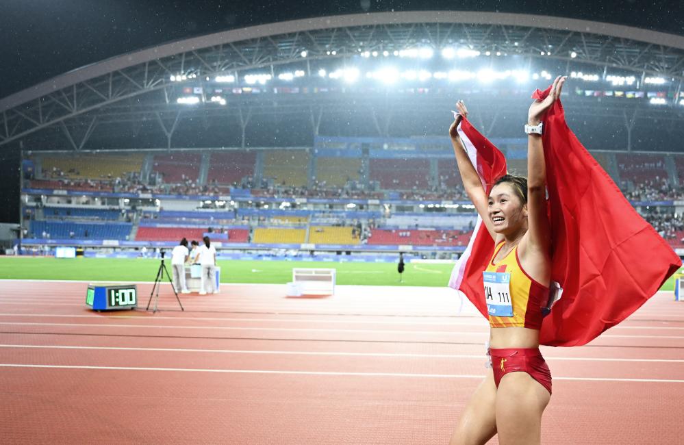 8月1日,夏雨雨在比賽后慶祝。新華社記者王曦攝