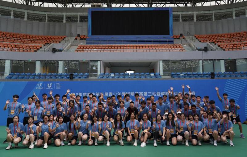 參與服務成都大運會網(wǎng)球賽事的志愿者在此前的測試賽中合影留念