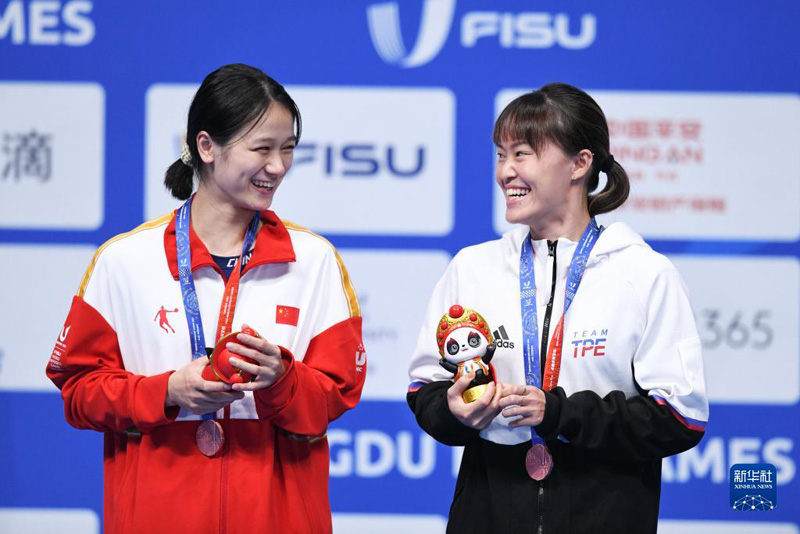 8月7日,季軍中國臺北選手許玟琪(右)和中國選手張藝曼在頒獎儀式上。新華社記者 張端 攝