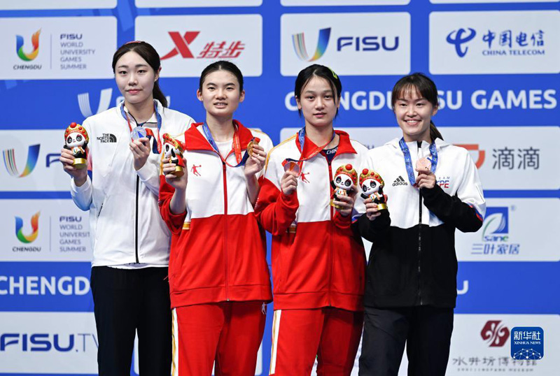 8月7日,冠軍中國選手韓悅(左二)、亞軍韓國選手金佳覽(左一)、季軍中國臺北選手許玟琪(右一)和中國選手張藝曼在頒獎儀式上合影。新華社記者 晉美多吉 攝
