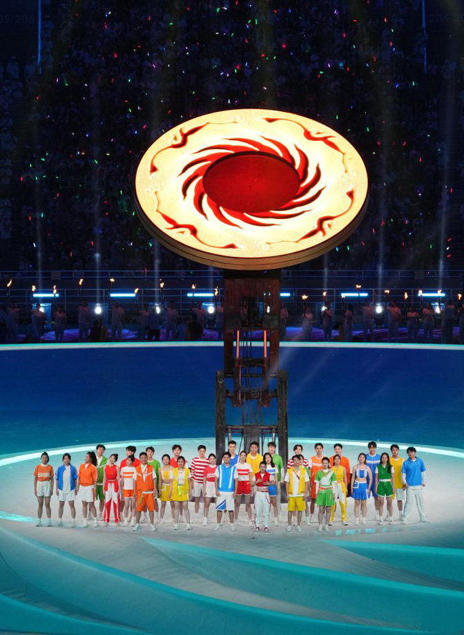 在成都大運會上,“太陽神鳥”的金色身影隨處可見。東安湖體育公園主體育場上方,巴掌大小的太陽神鳥金飾被放大了270萬倍,上萬塊彩釉玻璃拼裝出的“太陽神鳥”,迎接大地的仰望和天空的俯瞰;它還騰躍于成都大運會的火炬之上,淬火中展開理想,追求光明……