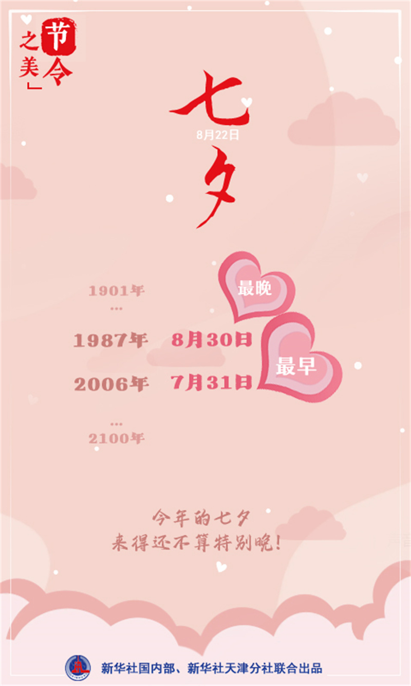 今年的七夕是來得最晚的嗎?不是!1901年至2100年這200年的統(tǒng)計結(jié)果顯示,七夕對應的公歷日期最早可落在7月31日(如2006年),最晚可落在8月30日(如1987年),這也意味著,公歷7月31日至8月30日中的任何一天都有可能成為七夕。照此來看,今年的七夕來得還不算特別晚。