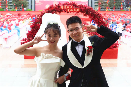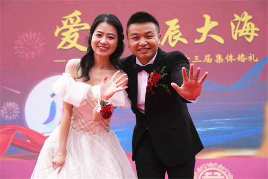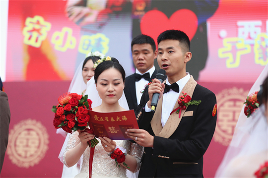 舞臺、氣球精心裝扮,美景、佳人喜迎幸福……婚禮現(xiàn)場,新郎們身著深色西裝,筆挺英?。恍履飩兩泶嵃谆榧?,美麗動人。一個(gè)個(gè)精心設(shè)置的儀式,一張張洋溢幸福的笑臉,讓這場集體婚禮甜蜜加倍、幸福爆表。