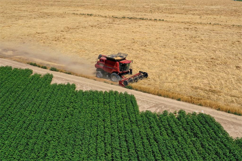 新疆呼圖壁縣五工臺鎮(zhèn)小泉村,農(nóng)機手駕駛聯(lián)合收割機收割小麥。新華社記者丁磊 攝