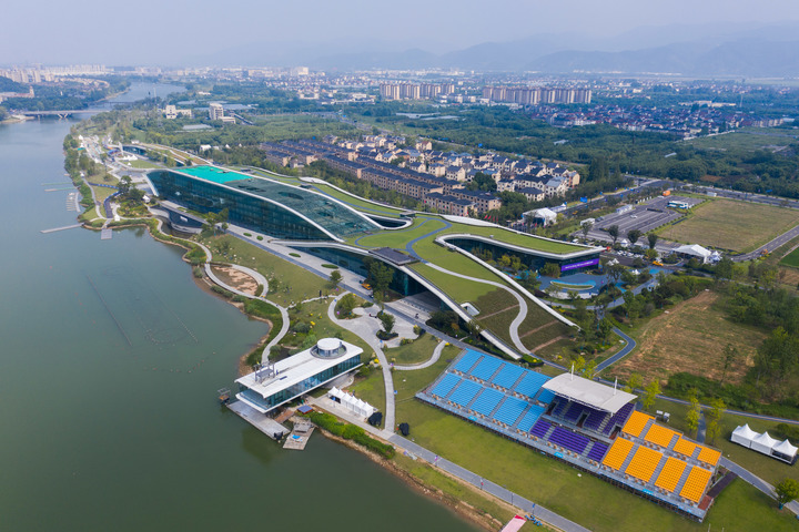 8月24日,空中俯瞰杭州富陽(yáng)水上運(yùn)動(dòng)中心(無(wú)人機(jī)照片)。新華社記者 徐昱 攝