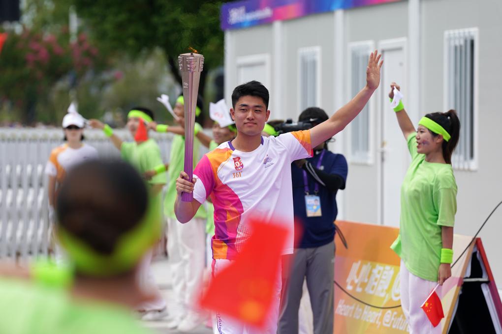 9月20日,火炬手吳易昺在火炬?zhèn)鬟f中。新華社記者 杜宇 攝