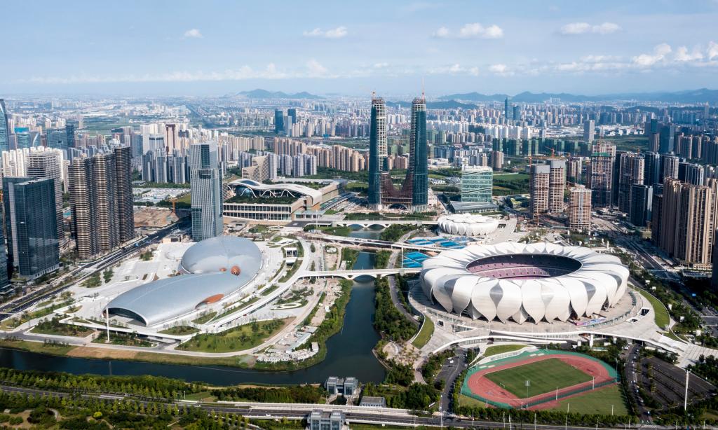 這是2021年8月2日拍攝的杭州奧體中心場館群(無人機照片)。新華社發(fā)(杭州亞組委供圖)