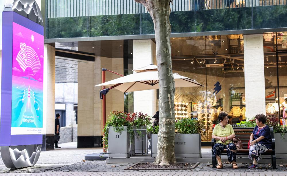 9月20日,市民在亞運會主題標識牌旁的長椅上聊天。 新華社記者顏麟蘊 攝