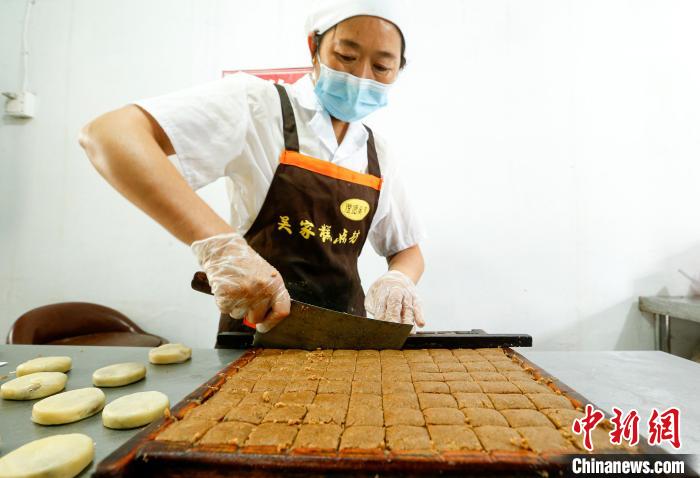 9月19日,臨近中秋,在安徽省黃山市徽州區(qū)潛口鎮(zhèn)澄塘村,傳統(tǒng)火腿月餅進(jìn)入產(chǎn)銷旺季。制餅手藝人經(jīng)過和油面、扯面團(tuán)、包油酥、包餡料、烤制等純手工工序,制成皮酥餡飽的火腿“土月餅”,深受食客的喜愛。