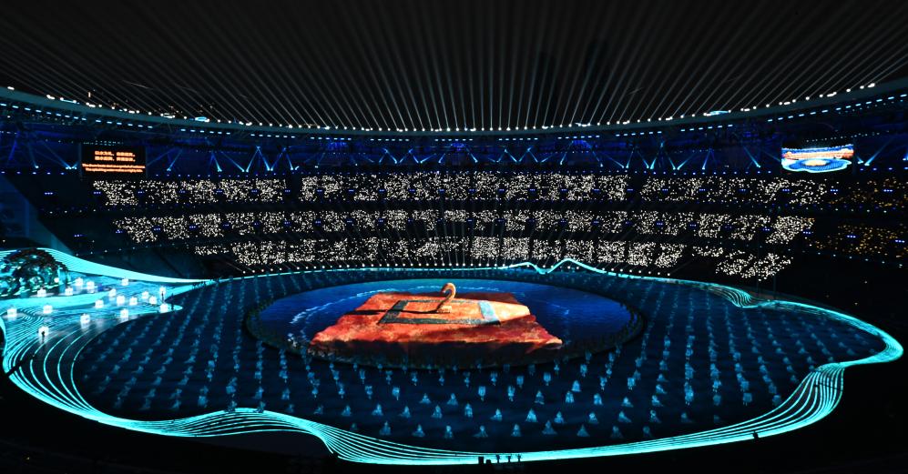 開幕式實現(xiàn)了兩個首創(chuàng):3D雙威亞首次應(yīng)用于大型運動場,首次采用“數(shù)實融合”的點火方式。