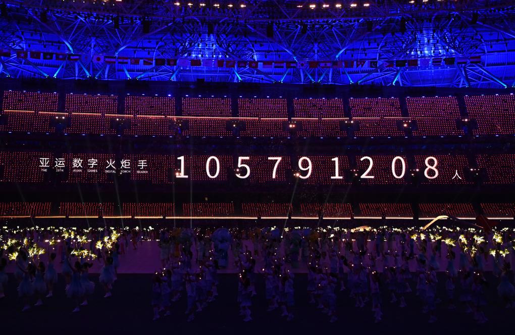 這是9月23日拍攝的開幕式現(xiàn)場顯示的亞運數(shù)字火炬手人數(shù)。新華社記者 黃宗治 攝