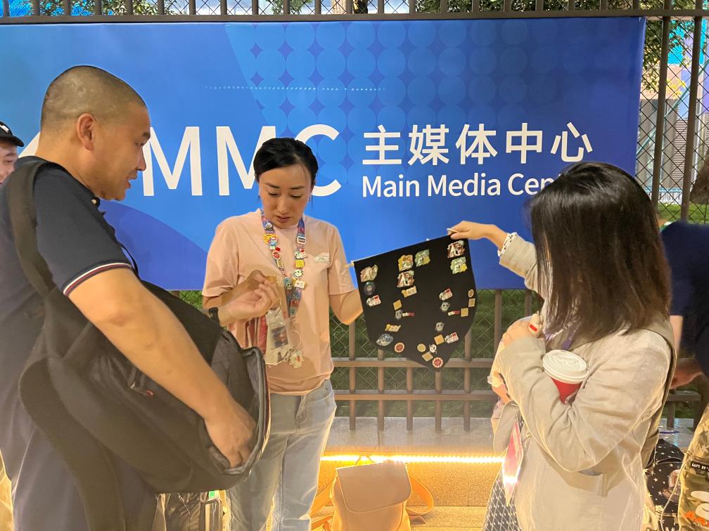 9月24日,在杭州國際博覽中心的主媒體中心,一位徽章愛好者與記者交換徽章。新華社記者 張璇 攝