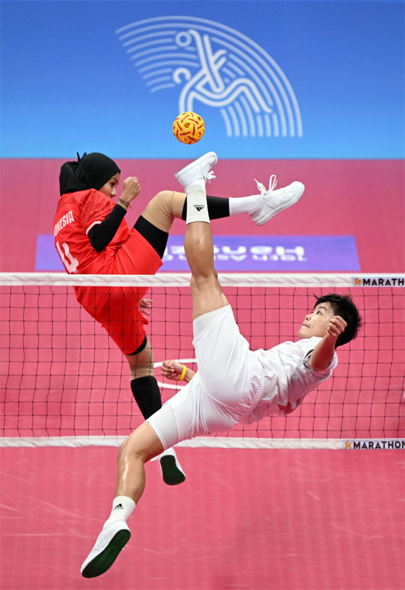 9月24日,泰國隊選手曼利卡·汶托(前)在杭州亞運會藤球女子單組團體預(yù)選賽A組比賽中進攻。新華社記者 陳鐘昊 攝