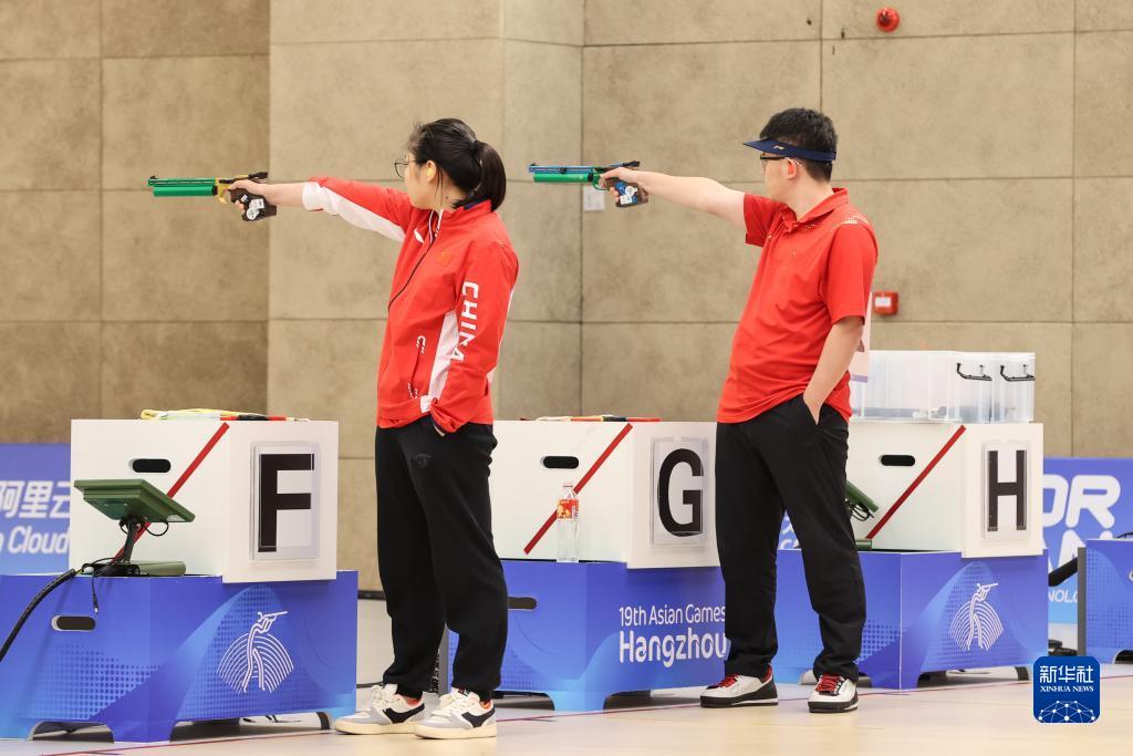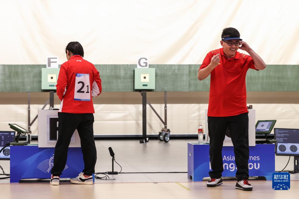 當(dāng)日,在杭州富陽銀湖體育中心舉行的杭州亞運會射擊項目混合團體10米氣手槍決賽中,中國組合張博文/姜冉馨以16比14戰(zhàn)勝印度組合薩拉布喬特·辛格/迪維婭·塔迪戈爾·蘇巴拉朱,奪得冠軍。