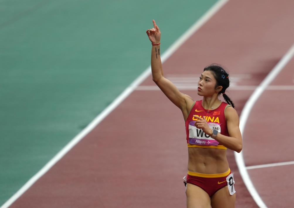9月30日,中國選手吳艷妮在田徑項目女子100米欄預賽比賽后慶祝。新華社記者 江文耀 攝