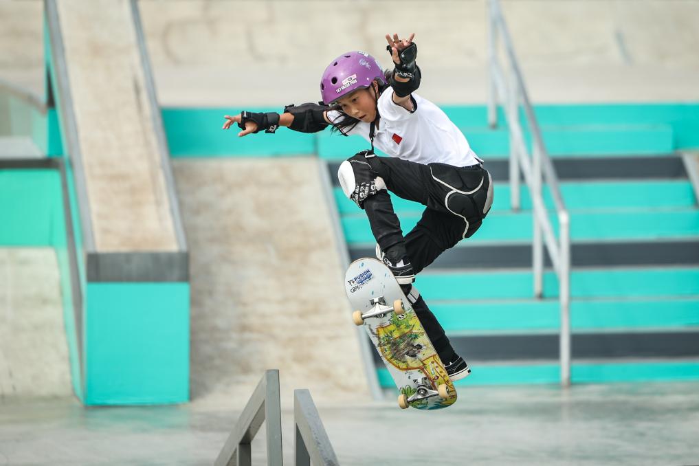 9月27日,在杭州亞運會滑板女子街式?jīng)Q賽中,中國選手崔宸曦以242.62分的成績奪得冠軍。新華社記者 潘昱龍 攝