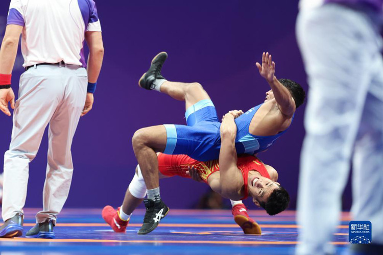 當(dāng)日,在杭州亞運(yùn)會(huì)摔跤項(xiàng)目男子古典式77公斤級(jí)四分之一決賽中,中國選手劉瑞戰(zhàn)勝印度選手維卡斯,晉級(jí)半決賽。