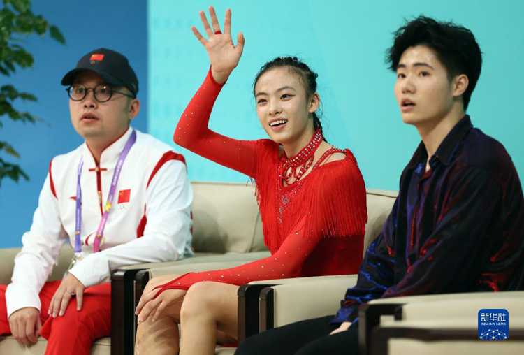 10月4日,中國組合張顥(右)和朱思怡(中)在賽后等候成績。