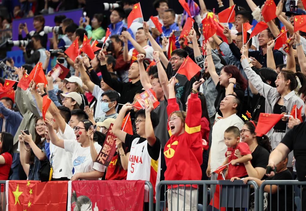杭州亞運(yùn)會(huì)女籃決賽,觀眾在看臺(tái)上為中國(guó)隊(duì)加油助威。新華社記者蘭紅光攝