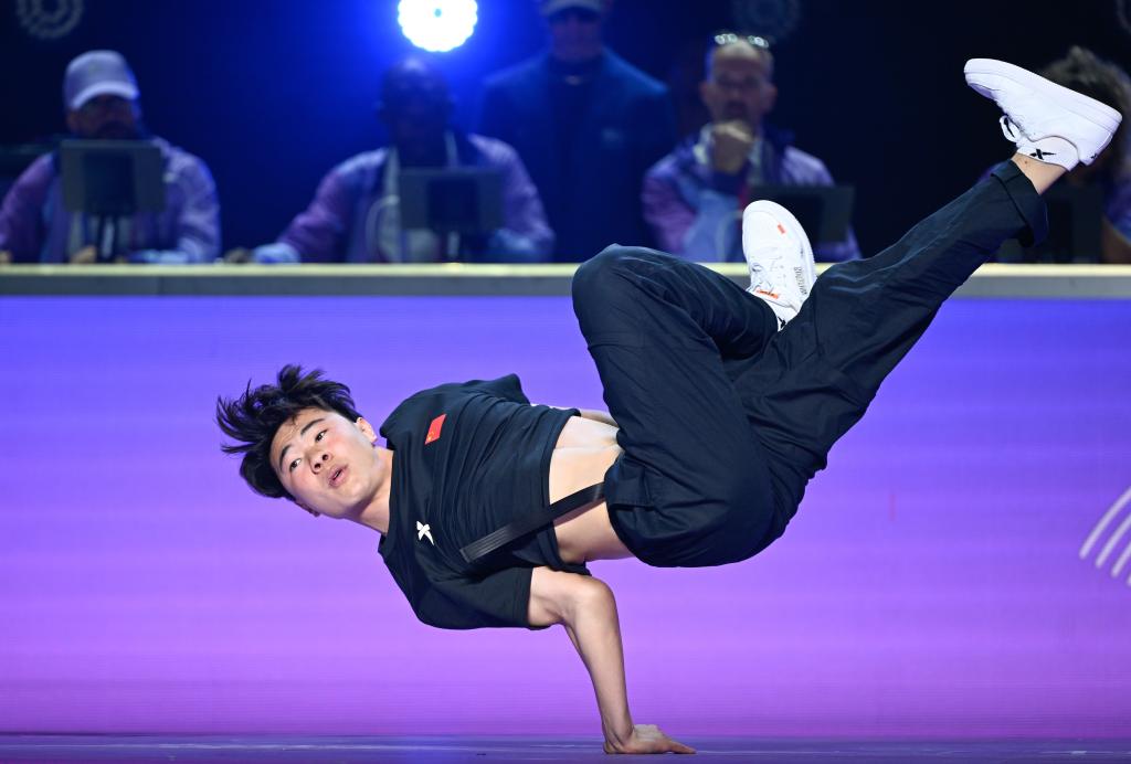 10月6日,杭州亞運(yùn)會(huì)霹靂舞項(xiàng)目開(kāi)賽。圖為亓祥宇在男子個(gè)人資格賽中。新華社記者 顏麟蘊(yùn) 攝