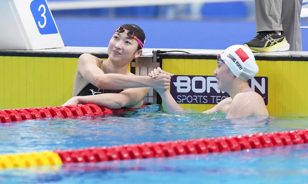 9月29日,中國選手張雨霏(右)與日本選手池江璃花子在比賽后。新華社記者 杜宇 攝