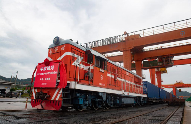 7月29日,滿載110個(gè)標(biāo)箱出口貨物的X8020次中歐班列從鐵路義烏西站鳴笛啟程。新華社發(fā)(時(shí)寬兵攝)